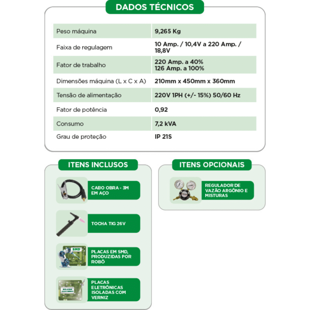 - Possibilita soldagem de alumínio (AC) e aço inox (DC) e demais ligas