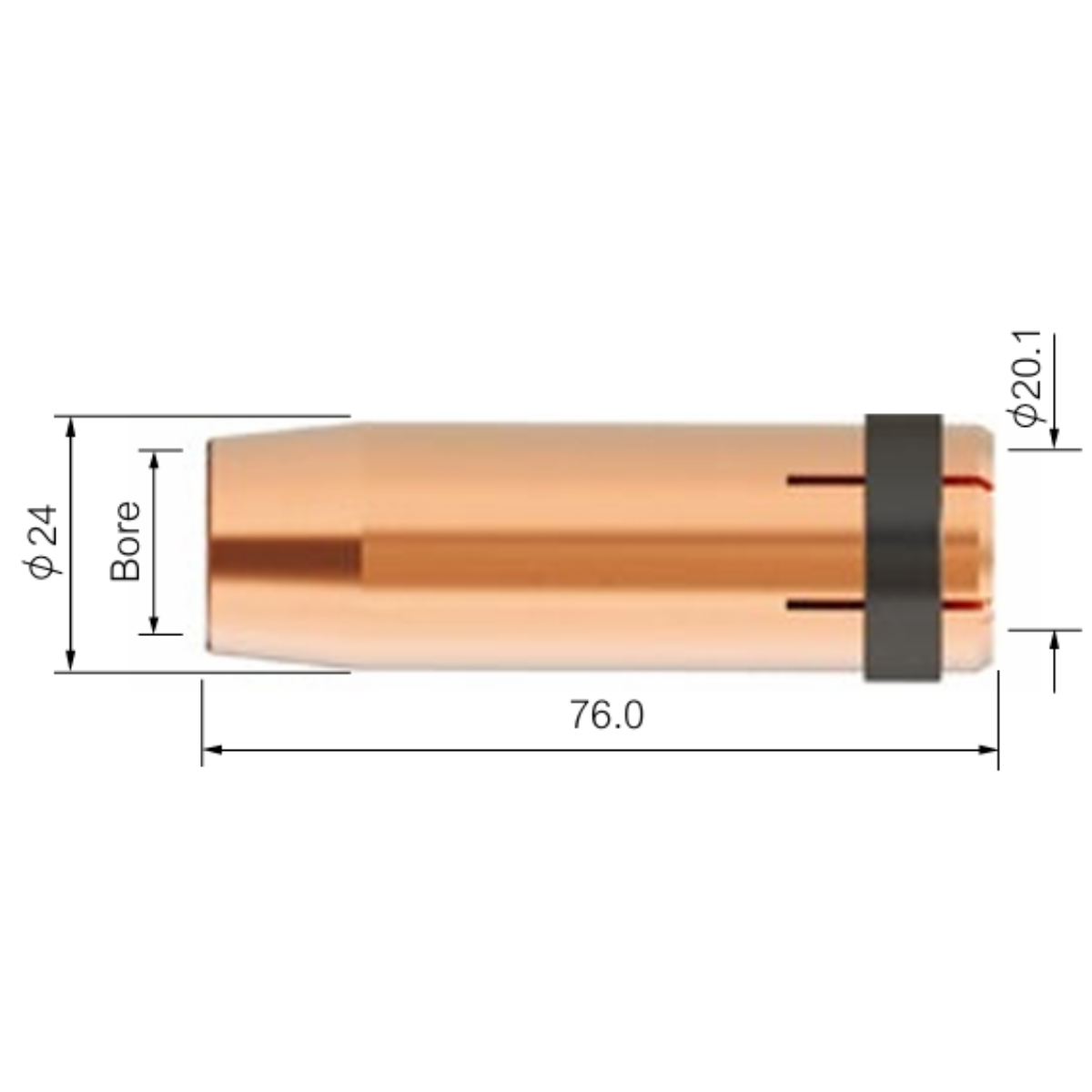 Bocal Cônico de Cobre para Tocha MIG 16,0MM X 76,0MM X 20,1MM – ESPESSURA 2,5MM (Ø Bocal x Comprimento x ר Mola)